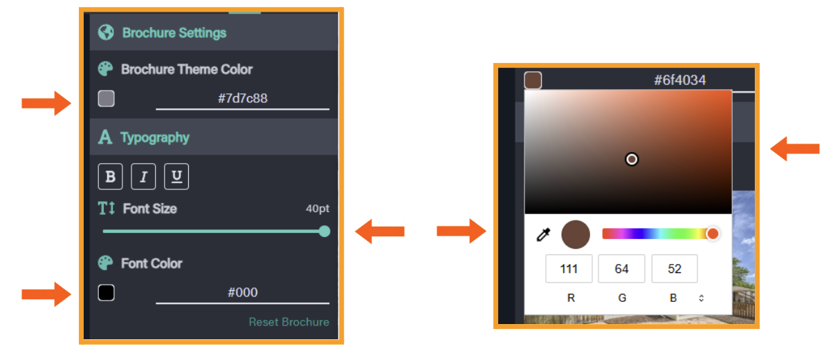 Change the background color of all text fields by clicking on the small color square under Brochure Theme Color. This opens the color palette, where you can